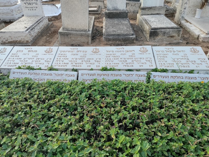 בשורת ארוכה קבורים חללי קרב טירה, ולצידם ארבע מצבות לזכר ארבעת הנופלים מהקרב אשר נעדרים עד היום. בהמשך החלקה טמונים עשרות חיילים ולוחמי המושבה תל מונד והמושבים בגוש.