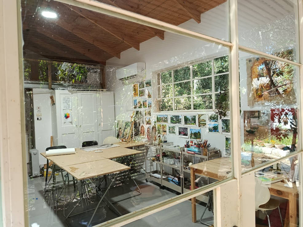 הסטודיו הפסטורלי שבחצר הבית טובל בירק. החוץ והפנים נושקים זה לזה דרך החלונות הגדולים והמרפסת.