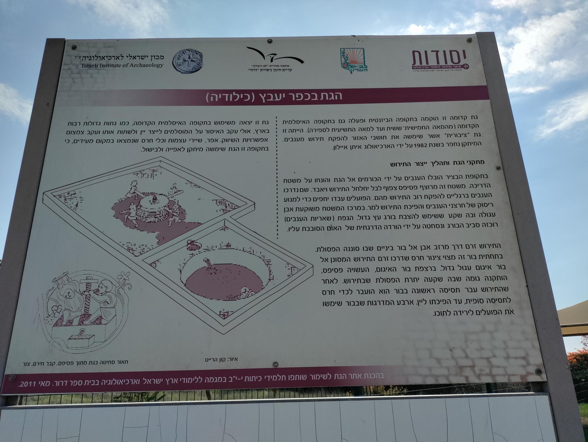 בשנות ה-80' נעשו במקום חפירות בידי איתן איילון, ונמצאה גת היין מן התקופה הביזנטית. ממצאים מן החפירה מעידים כי "כילודיא" היה יישוב חקלאי גדול, יחסית לאזור, שכלל מתקנים לעשיית יין ושמן.  זוהי גת יין ציבורית גדולה, מן הטיפוס האופייני לשרון, אשר הייתה בשימוש עד סוף התקופה הביזנטית במאה השישית לספירה.