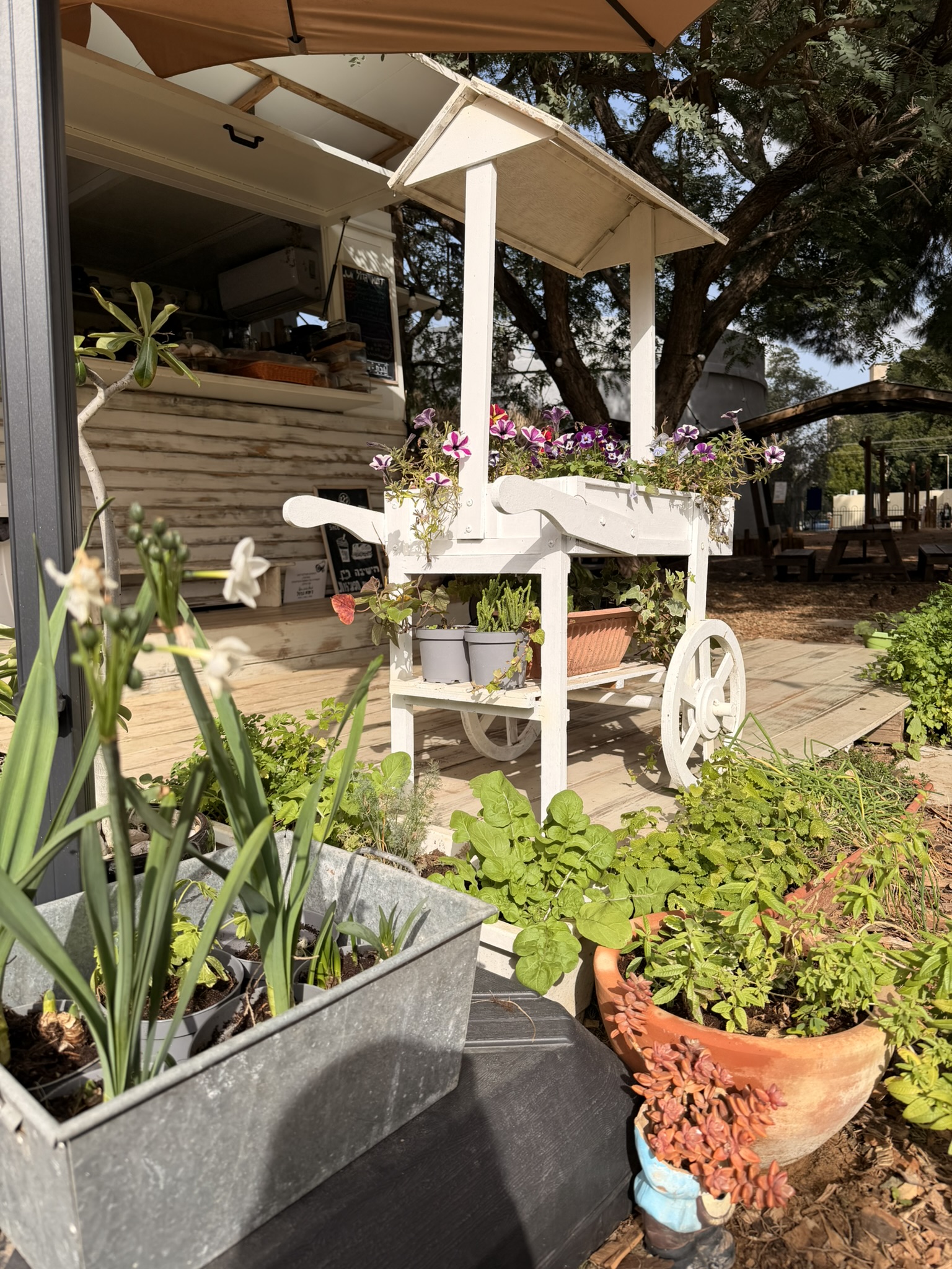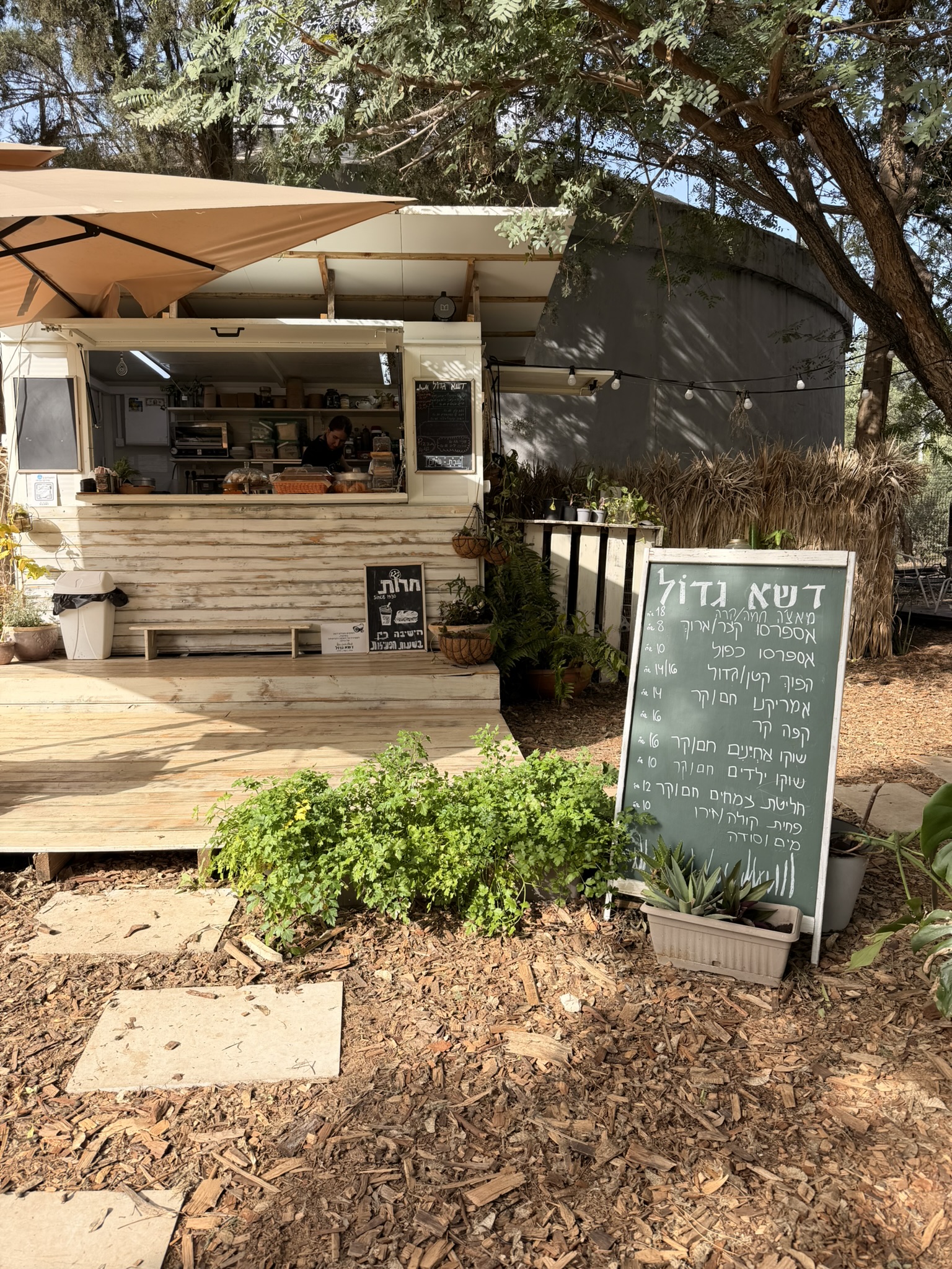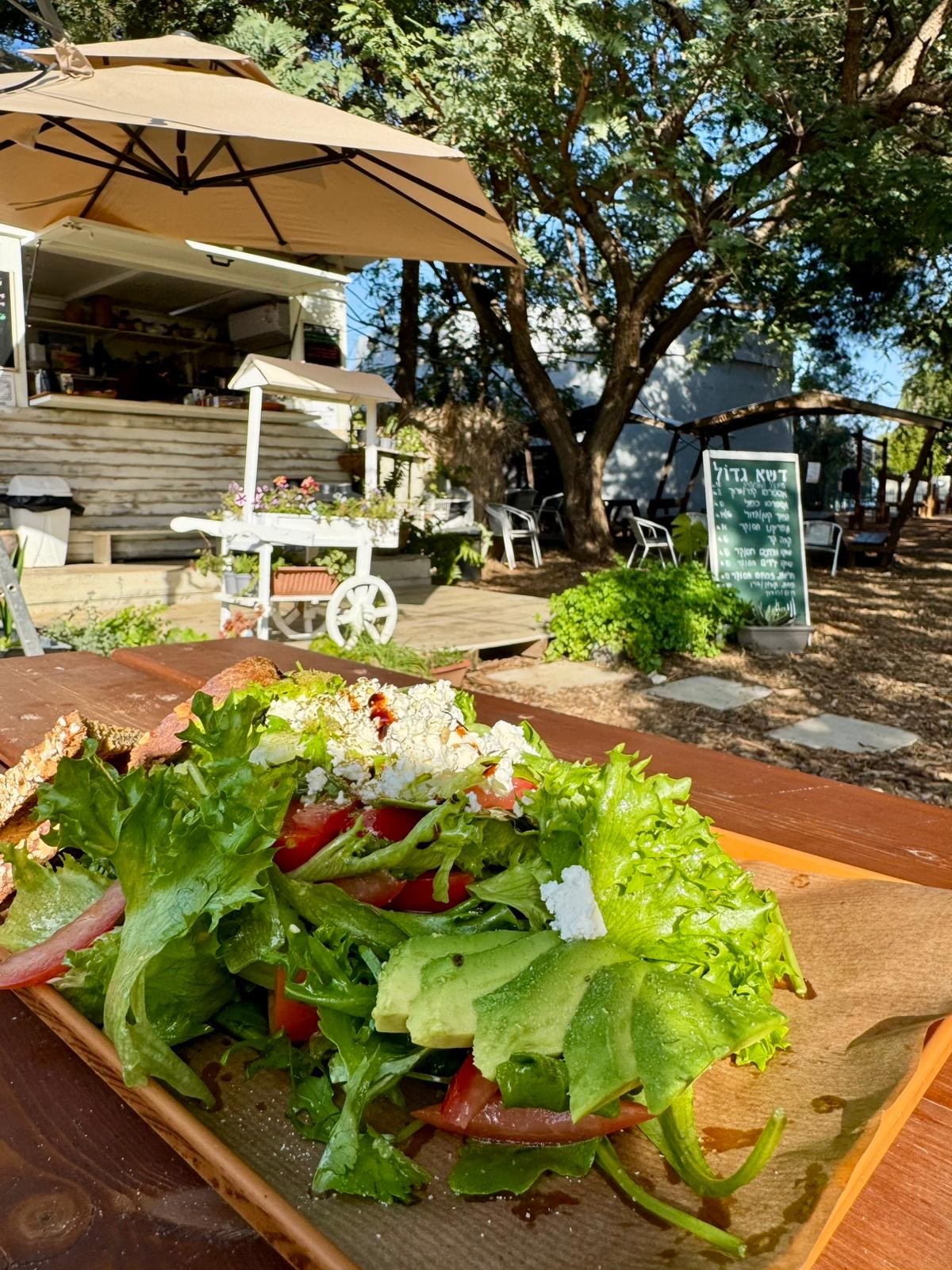 בצל העצים הותיקים תוכלו להנות מקפה איטלקי משובח, מיצים סחוטים, מאפים טריים ומנות עונתיות מתחלפות. בימי שישי חורפיים תזכו למרק עגבניות צלויות.