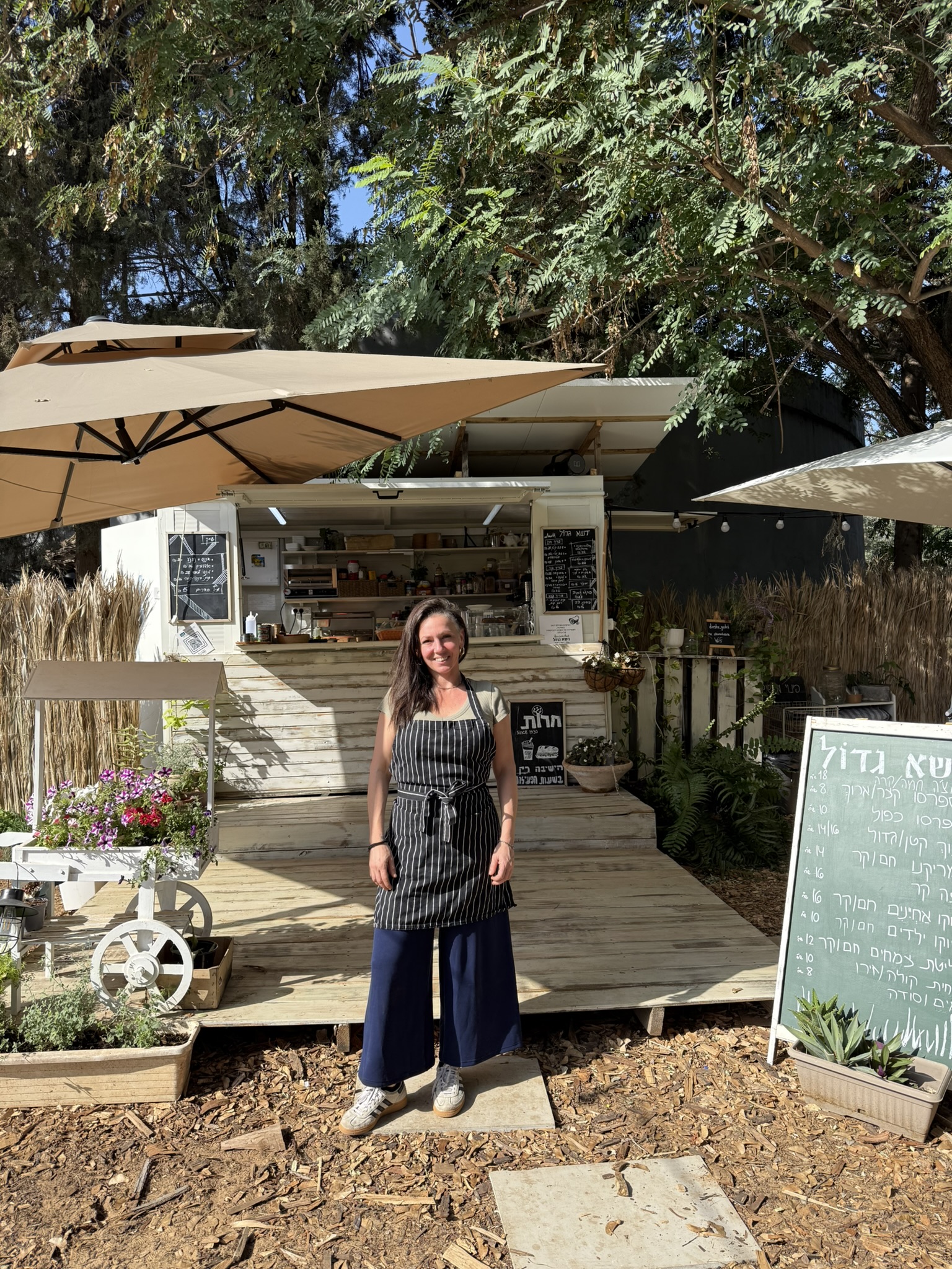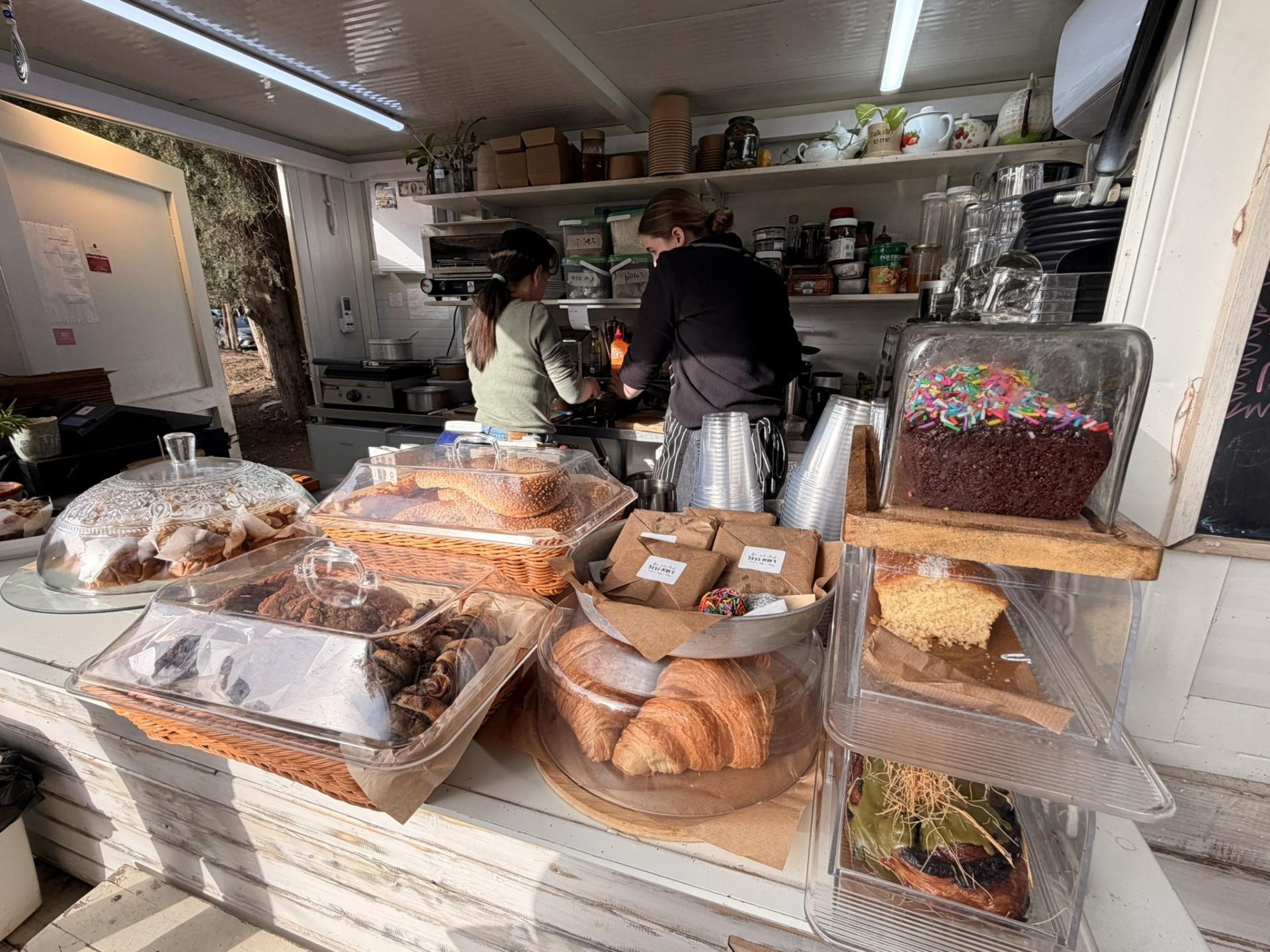 עגלת הקפה הקהילתית של שלומית ניצבת ממש קרוב לבית, בין בית העם לגן השעשועים בדשא הגדול במושב חרות.