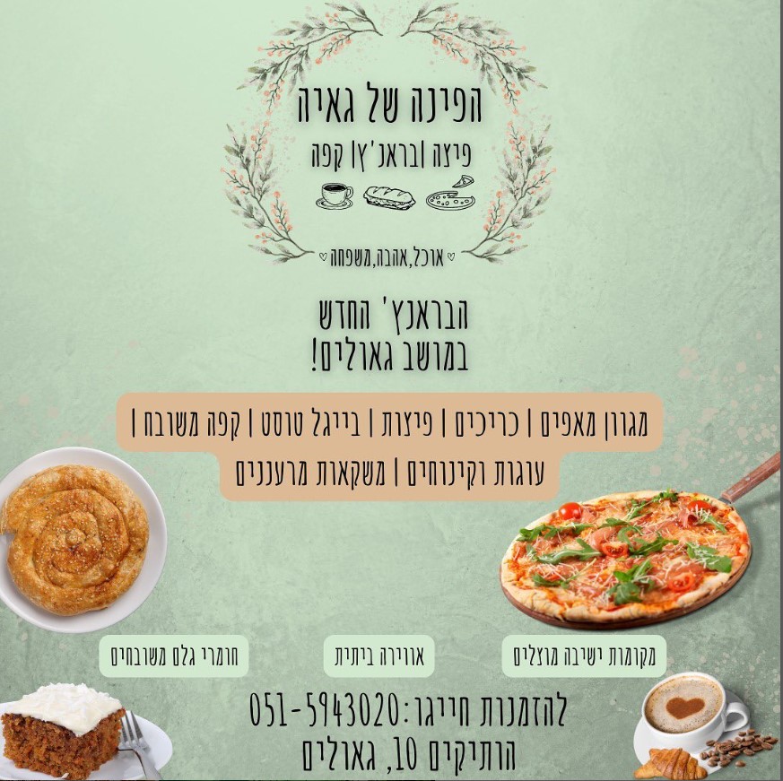 ארוחות בוקר, בראנץ' וצהריים, הכוללות מגוון מאפים, כריכים, פיצות, עוגות, ומבחר משקאות קרים וחמים.