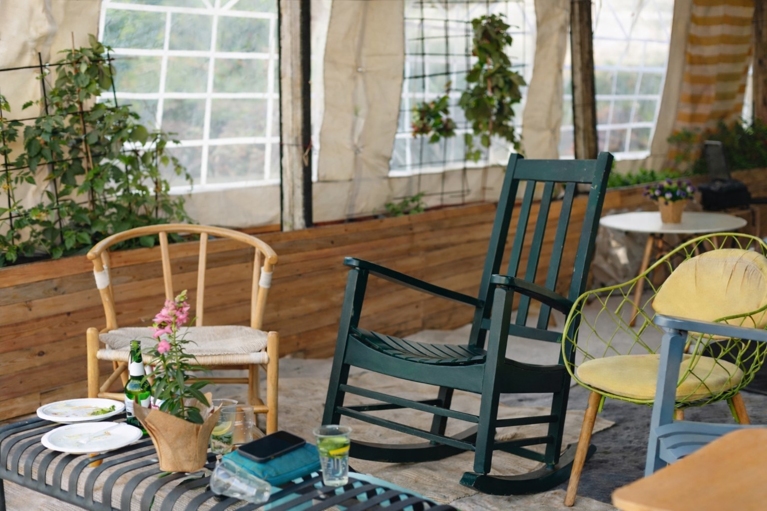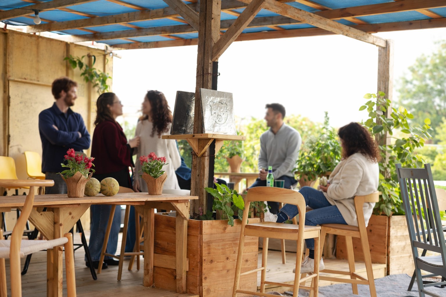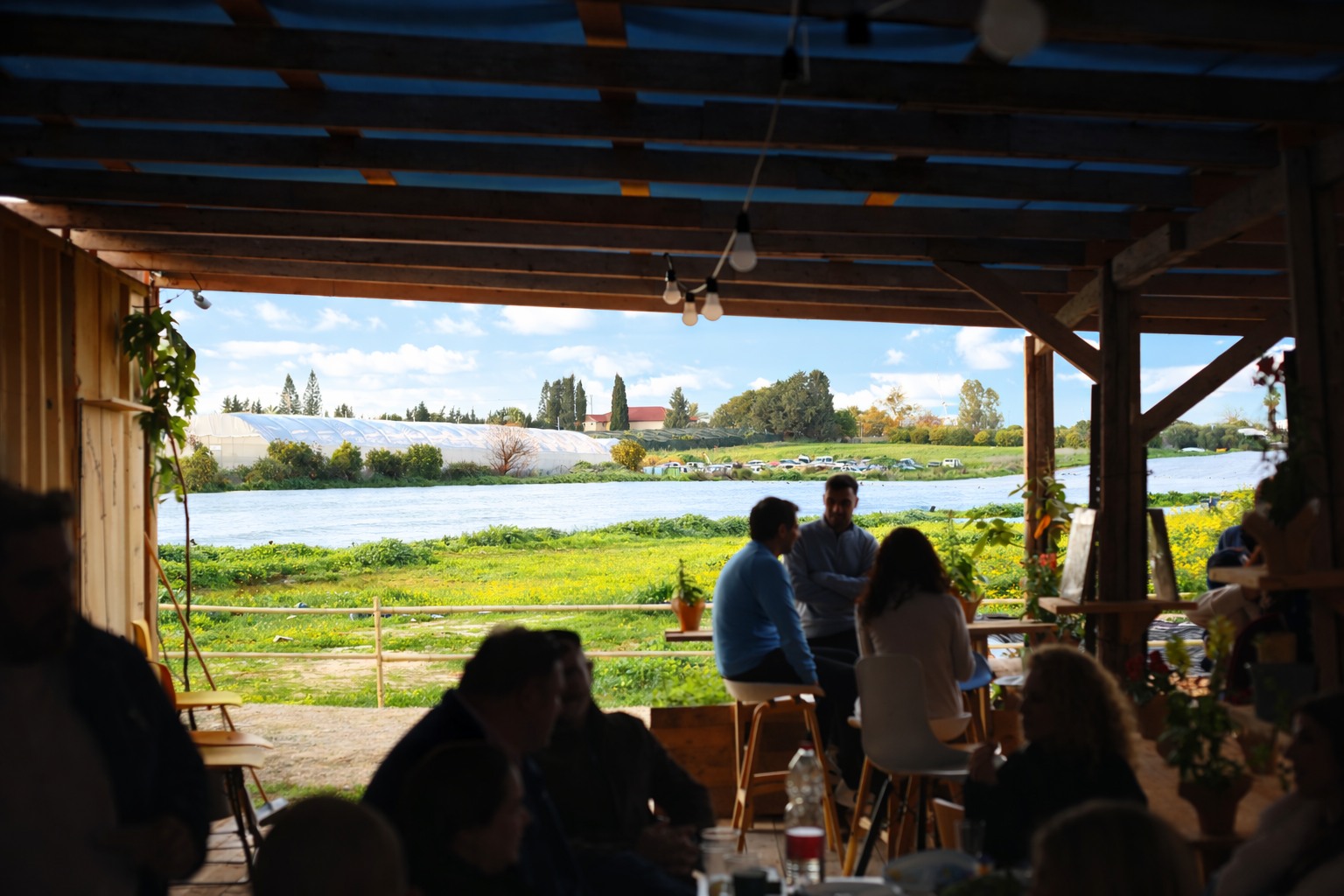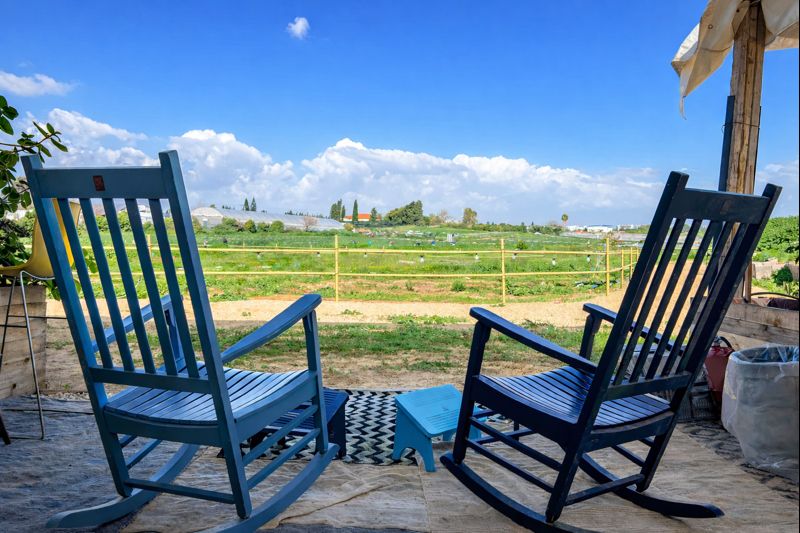 אזור מוצל של כ-100 מטרים רבועים לישיבה מול השדות ובריכות הנוי, עם אווירה ירוקה וטבעית.