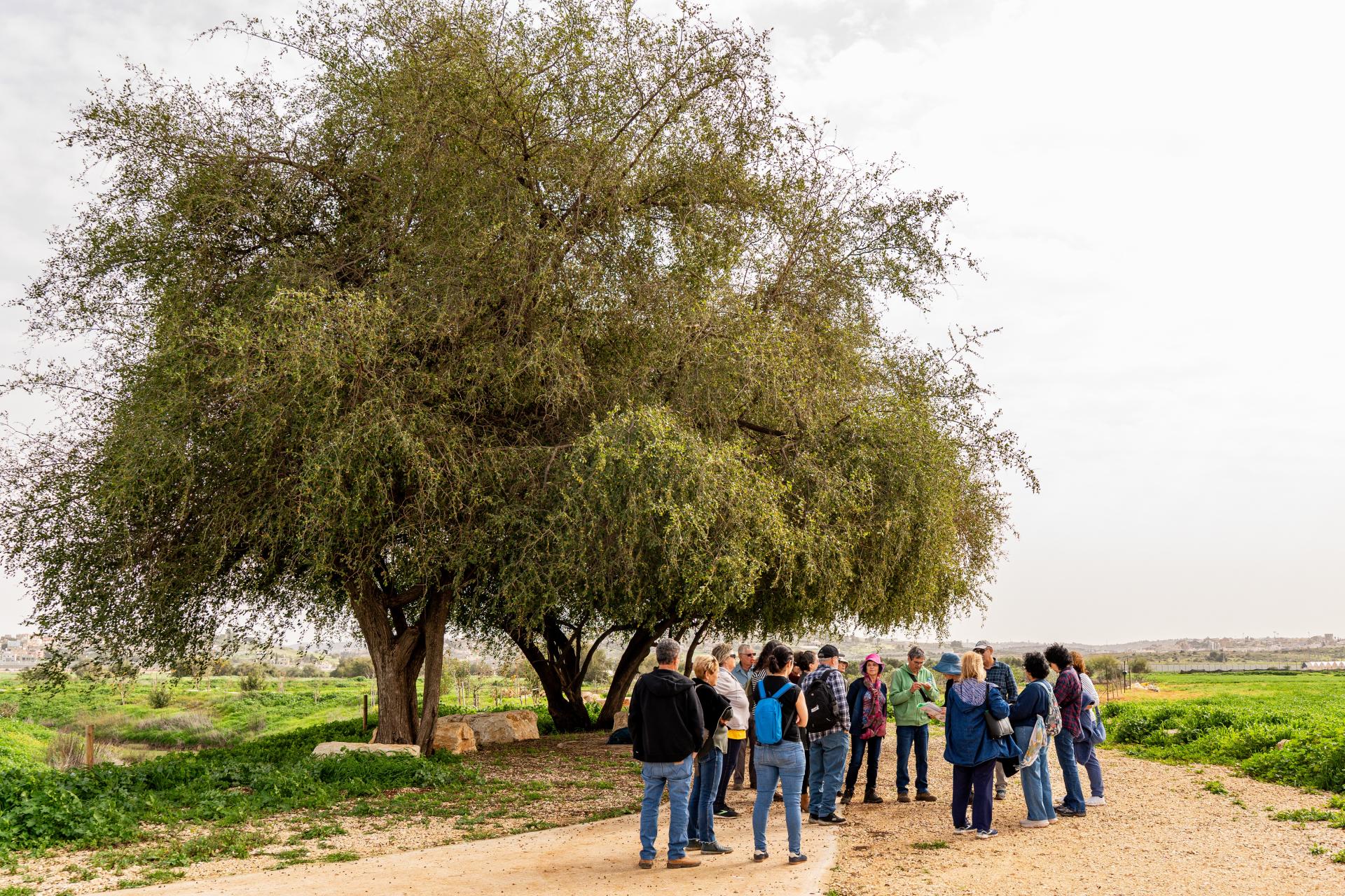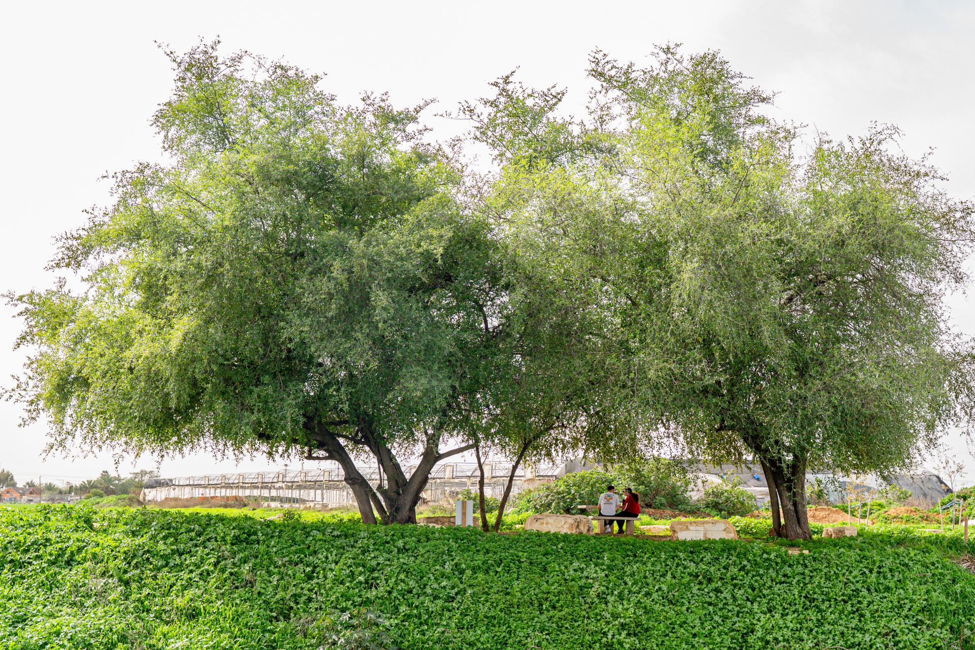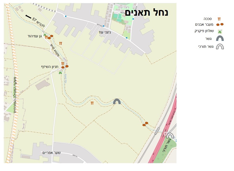שני עצי שיזף סמוכים זה לזה ונושקים צמרת, ובצידם שולחן פיקניק נגיש. בסמוך מעבר אבנים המאפשר גישה לגדה הצפונית. נקודת צל מצוינת לתחילת ההליכה. בחנייה הסמוכה מוצב תא שרותים. מכאן מערבה מתחיל מקטע שביל נגיש עד גן עמיהוד. אנו נפנה מזרחה על שביל של מצע מהודק.