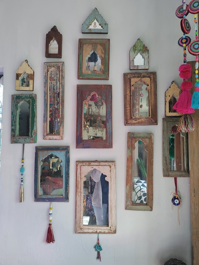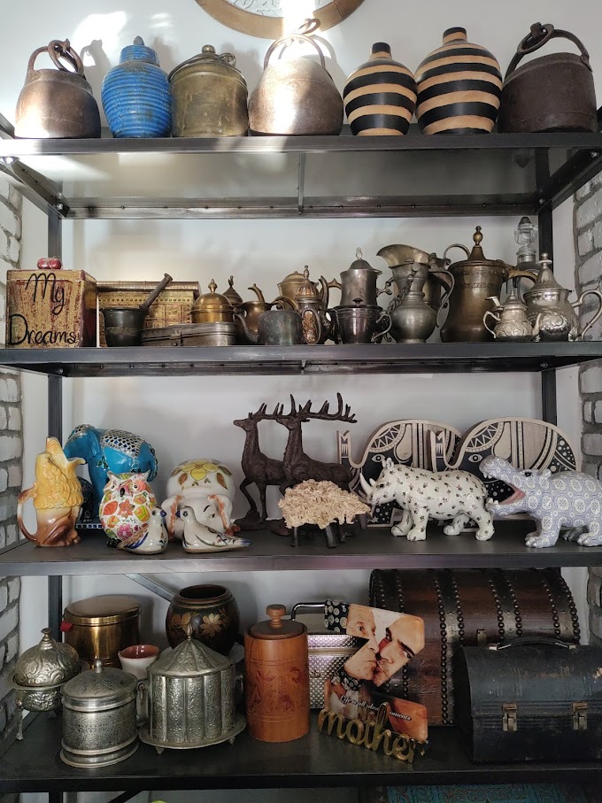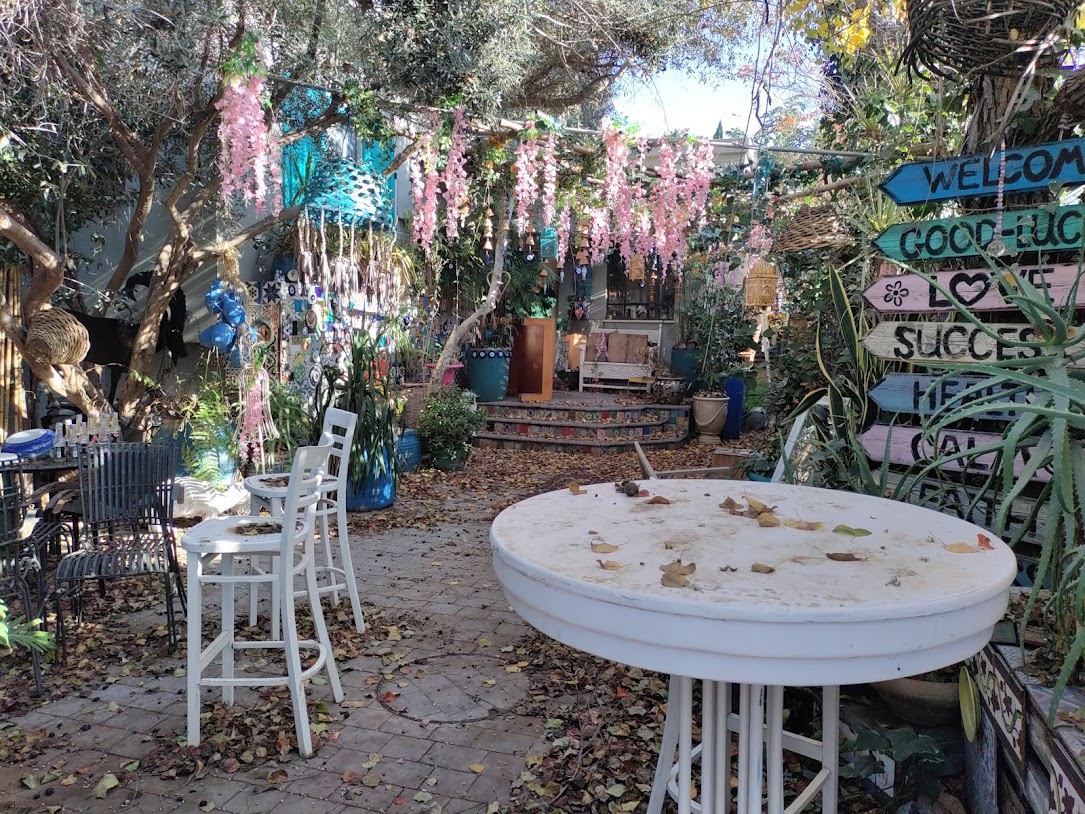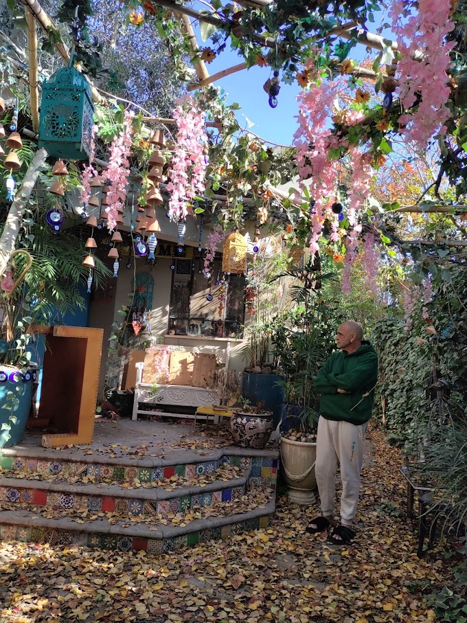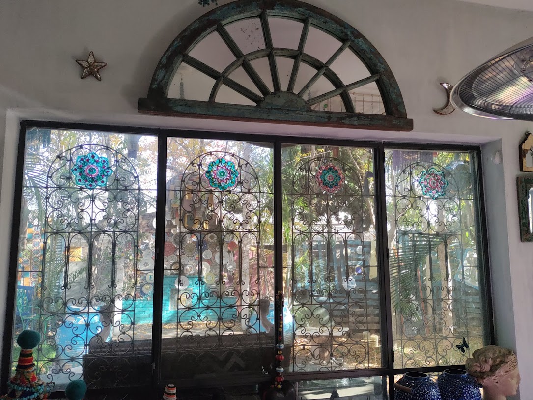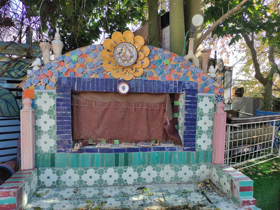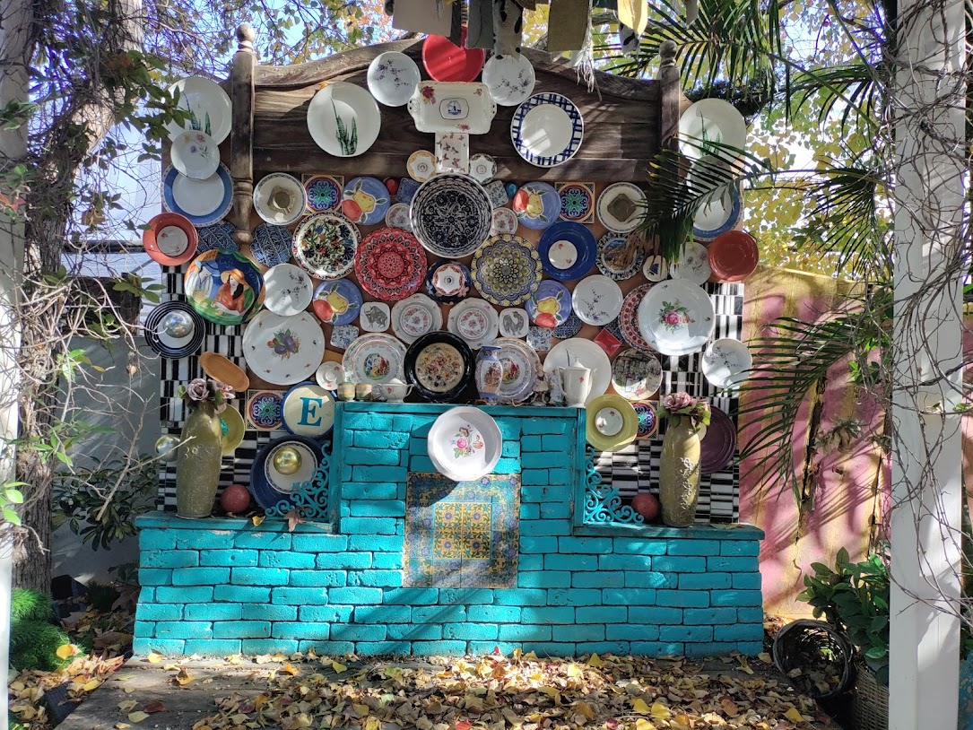 הבית, הקירות והחצר עמוסים קישוטי קרמיקה, צלחות, אהילים, פרחים, פעמונים, תמונות מעוצבות, מראות ממוסגרות, חלונות מעוטרים, קנקנים, חיות פורצלן ועוד אלפי פריטים.